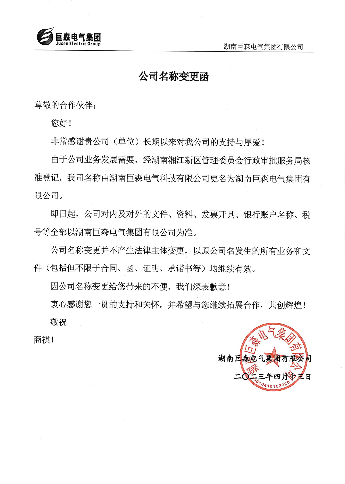 由于公司业务发展需要,经湖南湘江新区管理委员会行政审批服务局核准登记,我司名称由湖南巨森电气科技有限公司更名为湖南巨森电气集团有限公司。