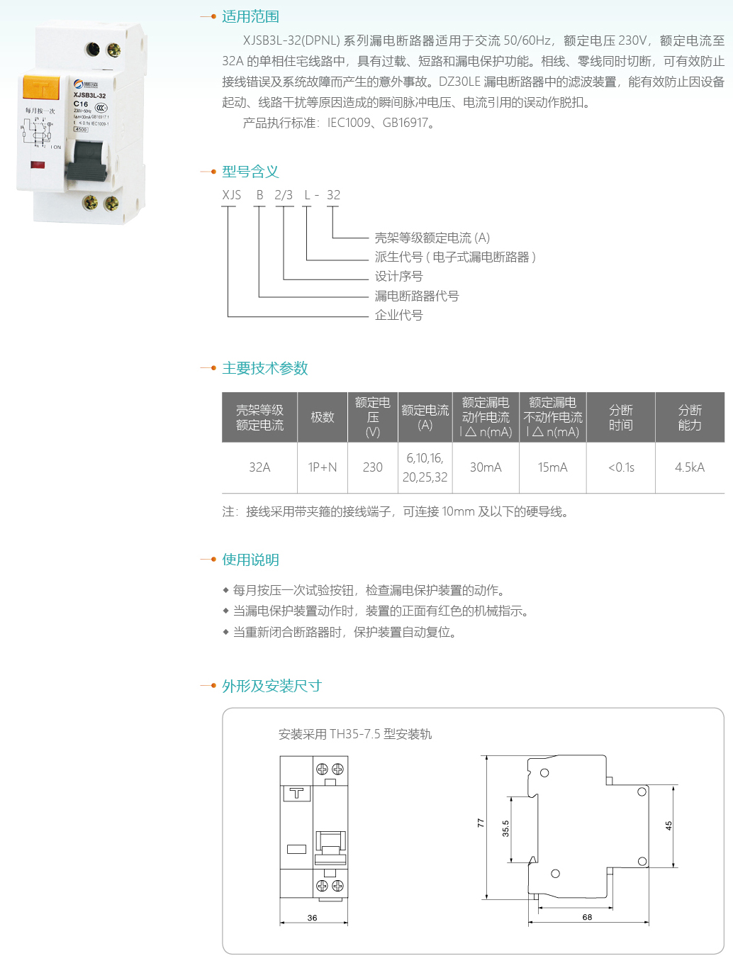 XJSB3L-32“ 相线+中性线+漏电”断路器