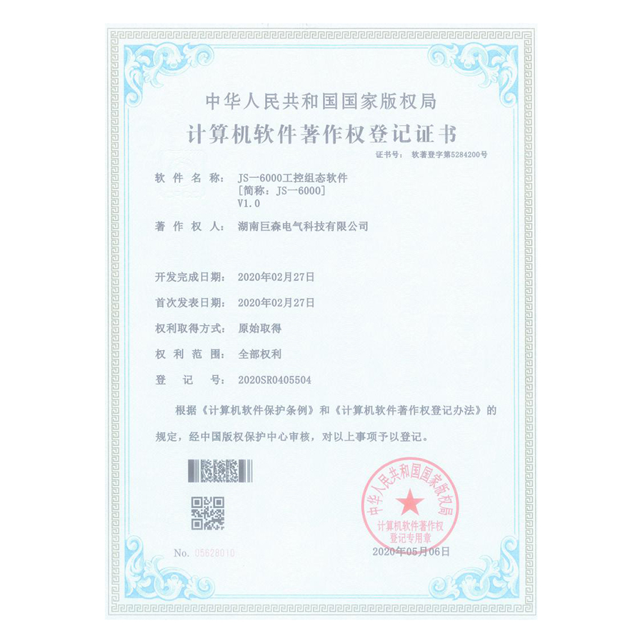计算机软件著作权登记证书-JS-6000工控组态软件V1.0