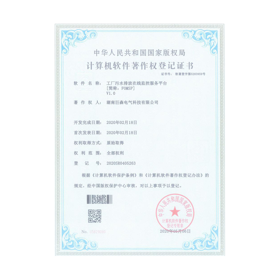 计算机软件著作权登记证书-工业污水排放在线监测平台(FOMSP)V1.0