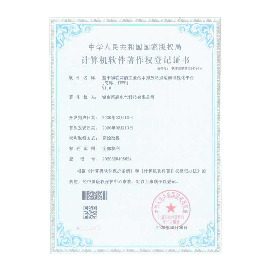 计算机软件著作权登记证书-基于物联网的工业污水排放站点运维可视化平台(IWVP)1.0