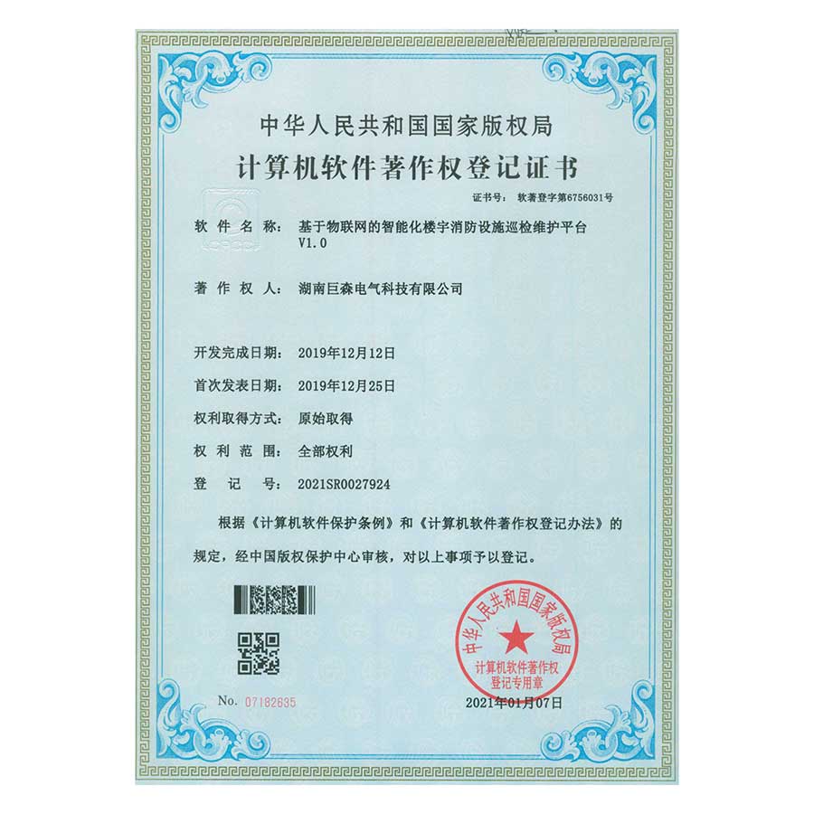 计算机软件著作权登记证书-基于物联网的消防设备巡检维护平台V1