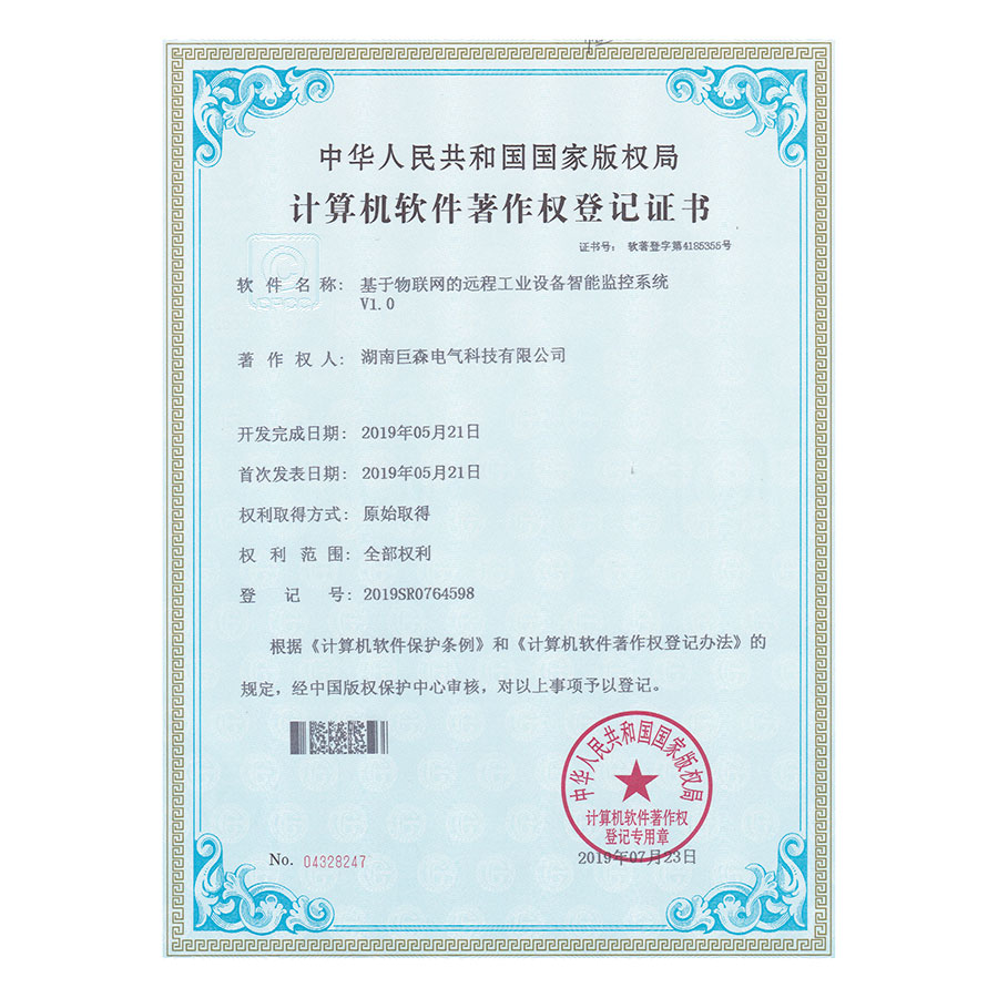 计算机软件著作权登记证书-基于物联网远程工业设备智能监控系统V1.0