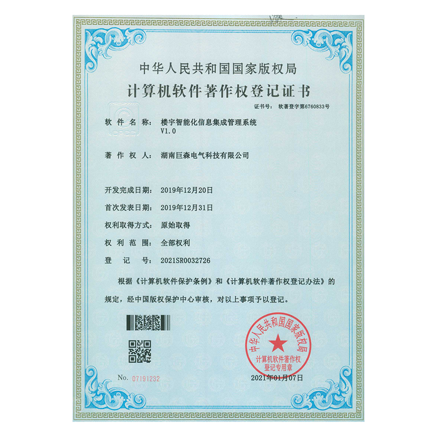 计算机软件著作权登记证书-楼宇智能化信息集成管理系统V1.0